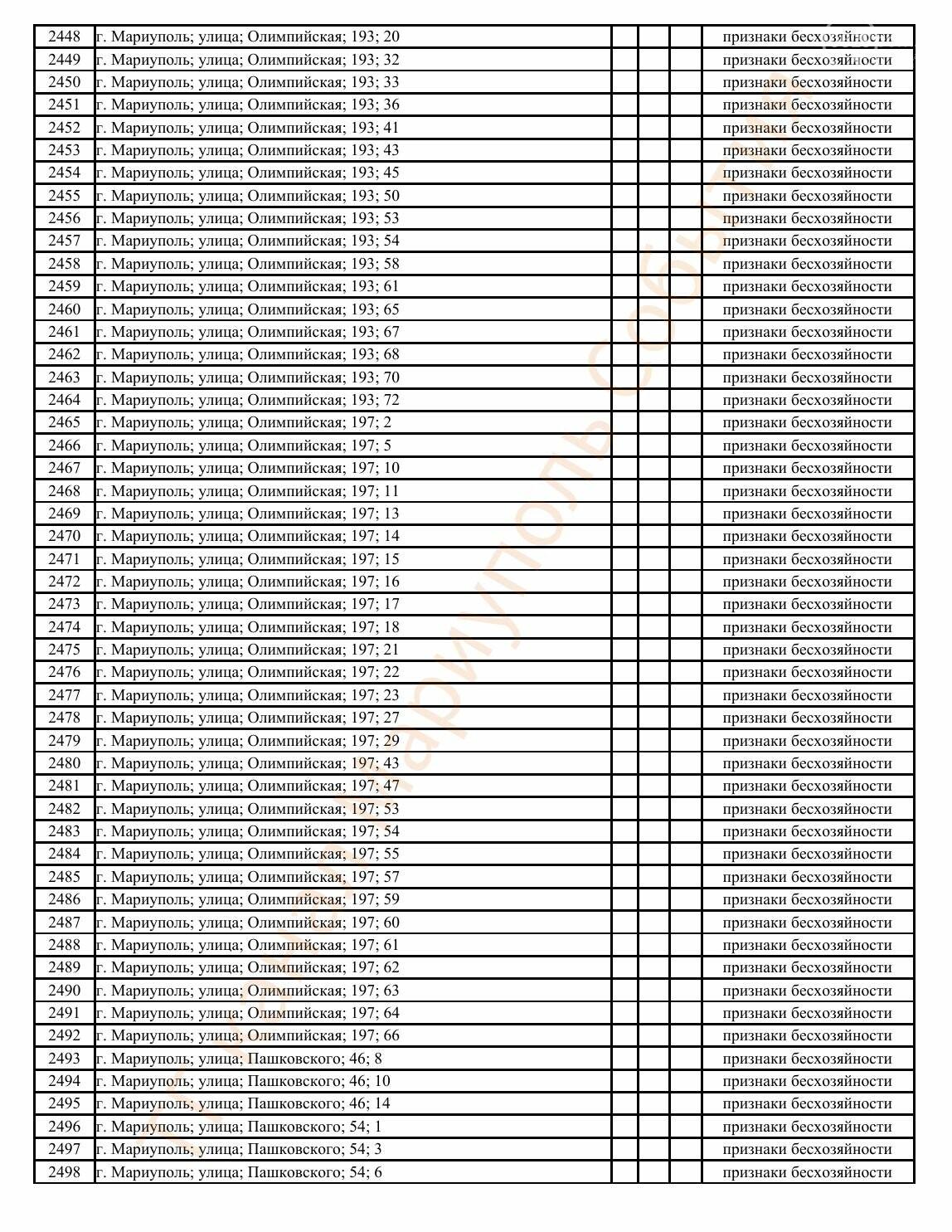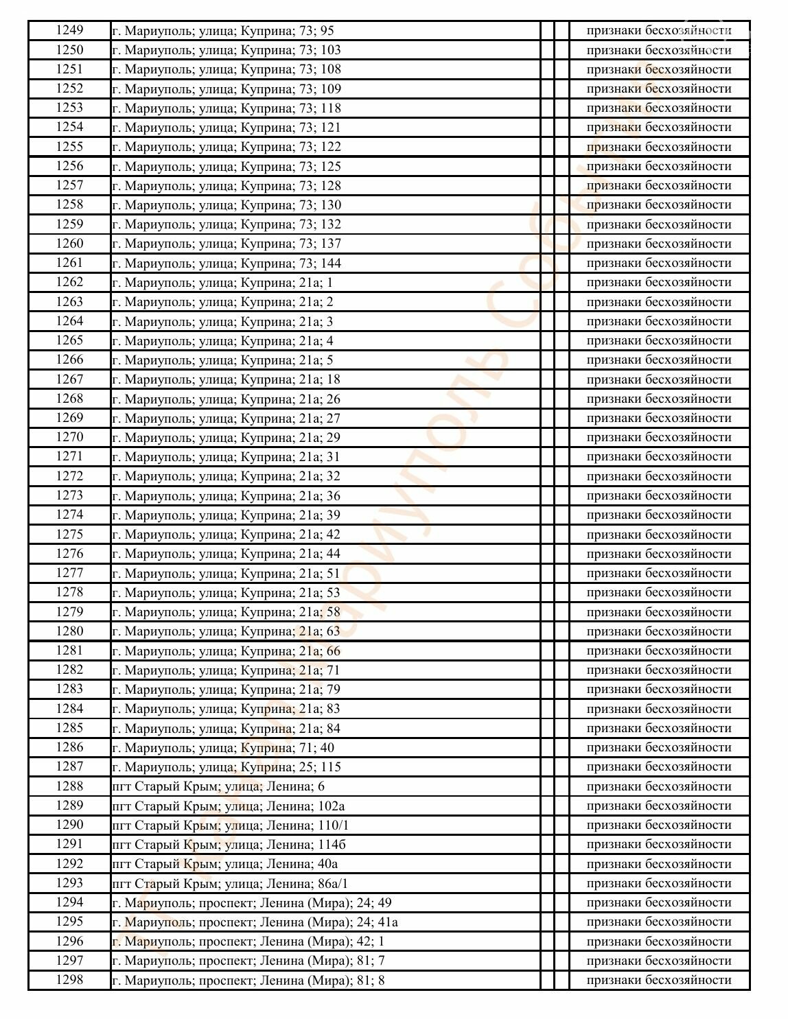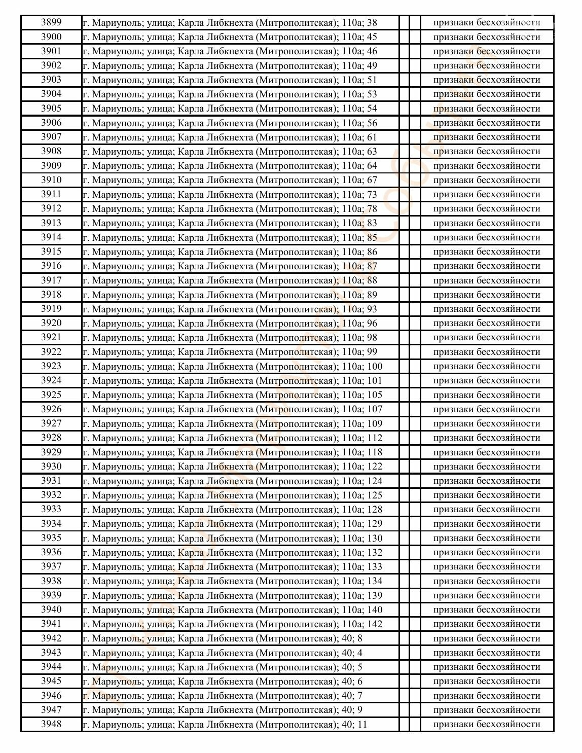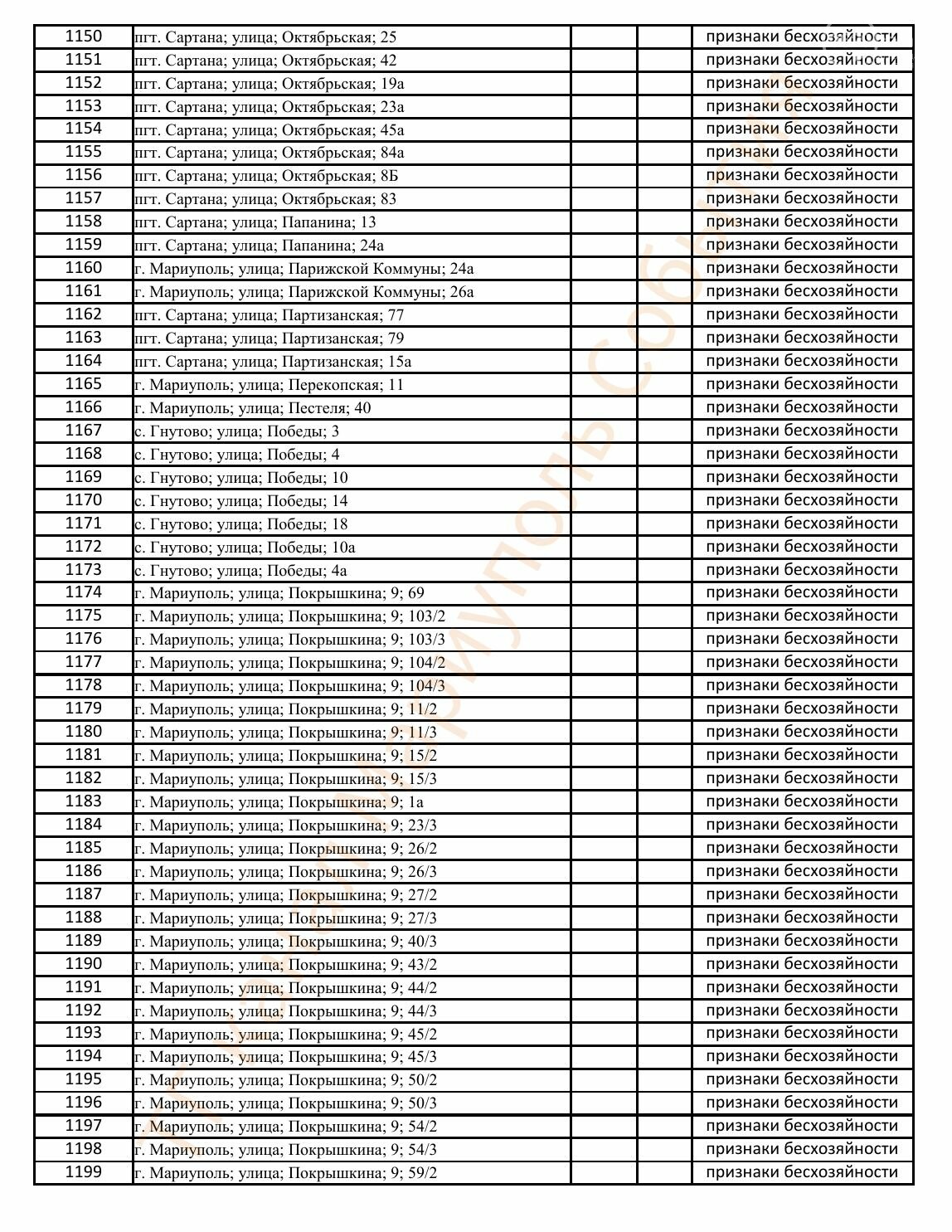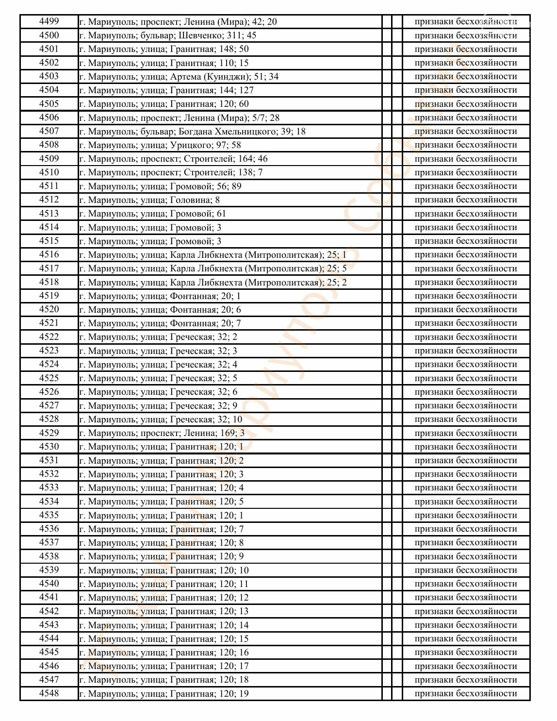Окупаційна адміністрація Маріуполя оприлюднила черговий перелік нерухомості, яку визнали такою, що «має ознаки безхазяйності». У списку — близько 13 тисяч об’єктів, переважно квартир та житлових приміщень.