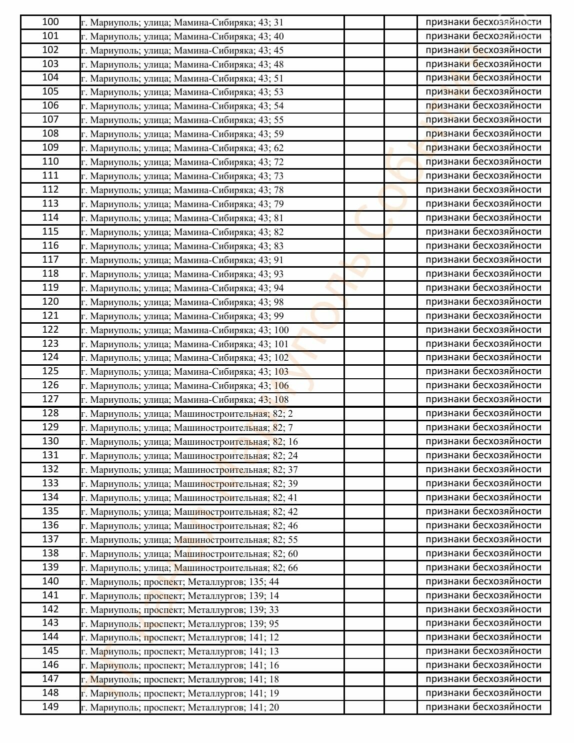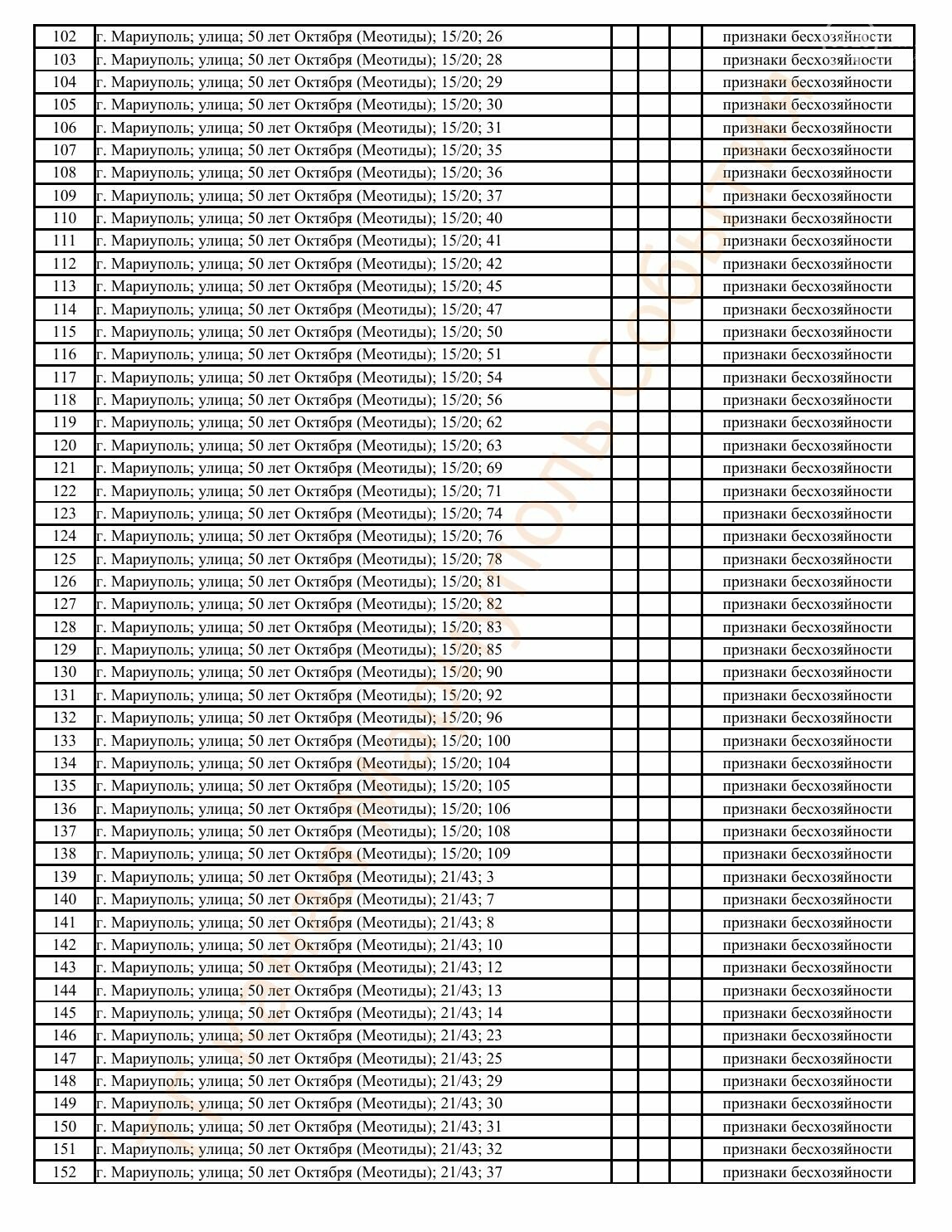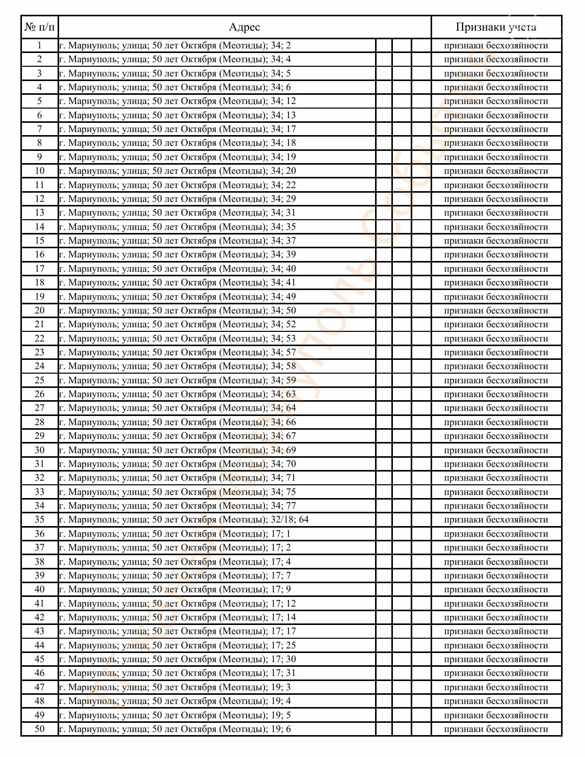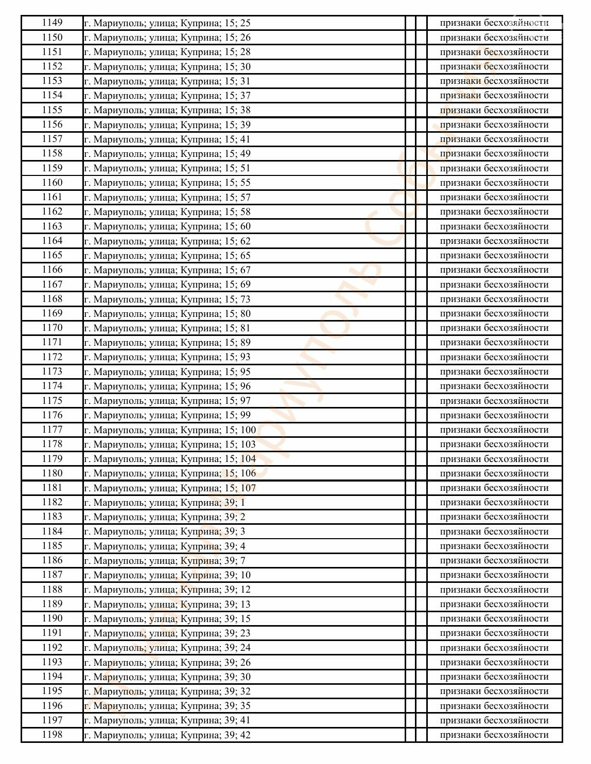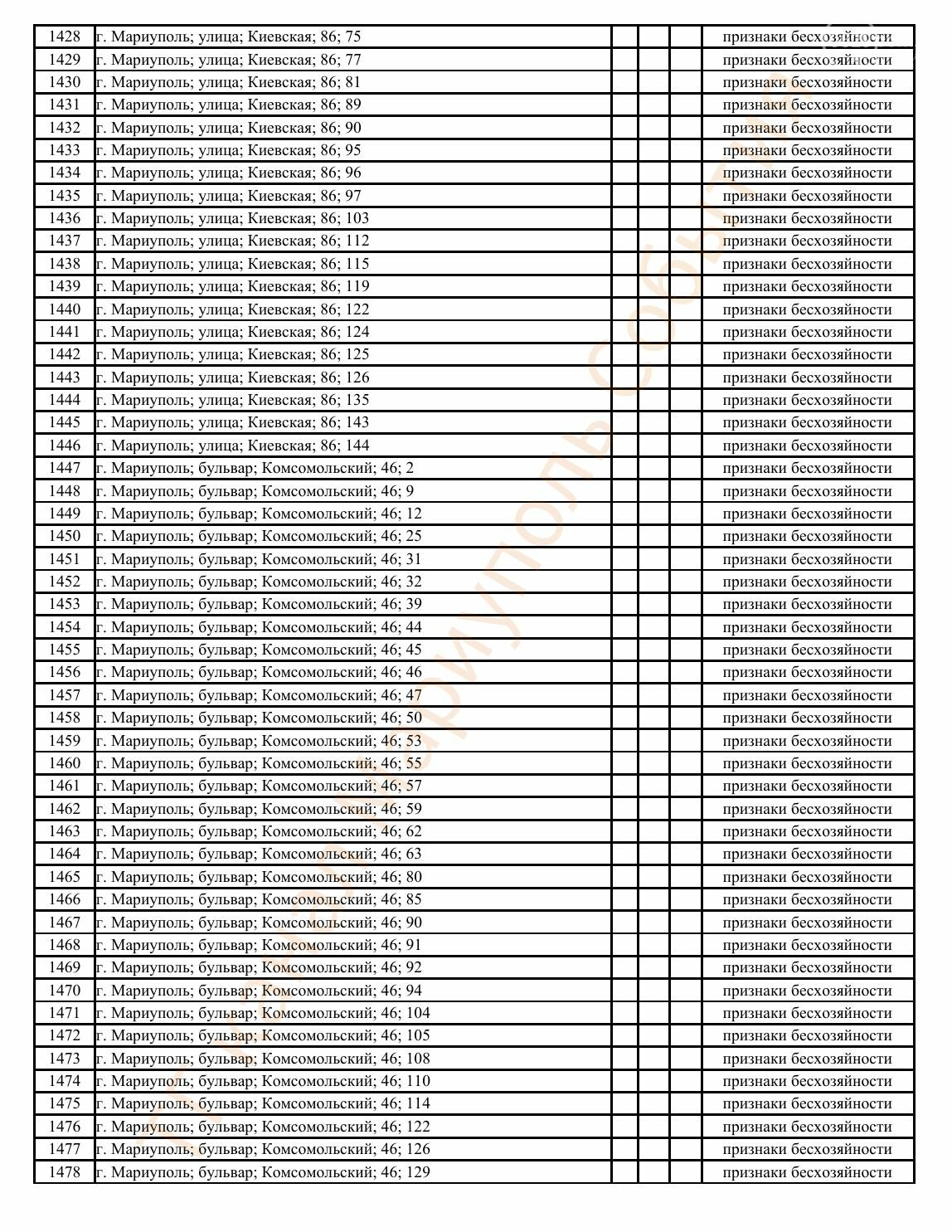 Окупаційна адміністрація Маріуполя оприлюднила черговий перелік нерухомості, яку визнали такою, що «має ознаки безхазяйності». У списку — близько 13 тисяч об’єктів, переважно квартир та житлових приміщень.