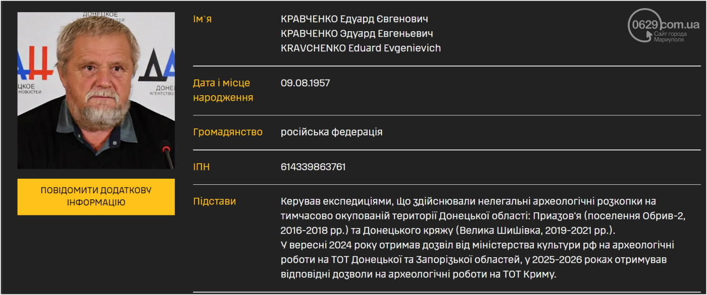 Серед фігурантів — співробітники так званого «донецького республіканського краєзнавчого музею» Едуард Кравченко та Віталій Войтенко. За даними розвідки, вони брали участь у нелегальних розкопках у районах Приазов’я та Донецького кряжу. Зокрема, кравченко очолював експедиції, а войтенко також є учасником збройної агресії проти України.