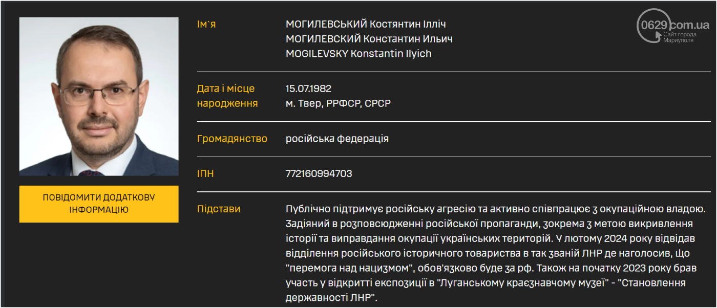 Також у переліку — заступник міністра науки і вищої освіти РФ Константін Могилевській, який є співголовою російського історичного товариства під керівництвом сергєя наришкіна. Це товариство поширює викривлені історичні наративи для виправдання війни та окупації українських територій.