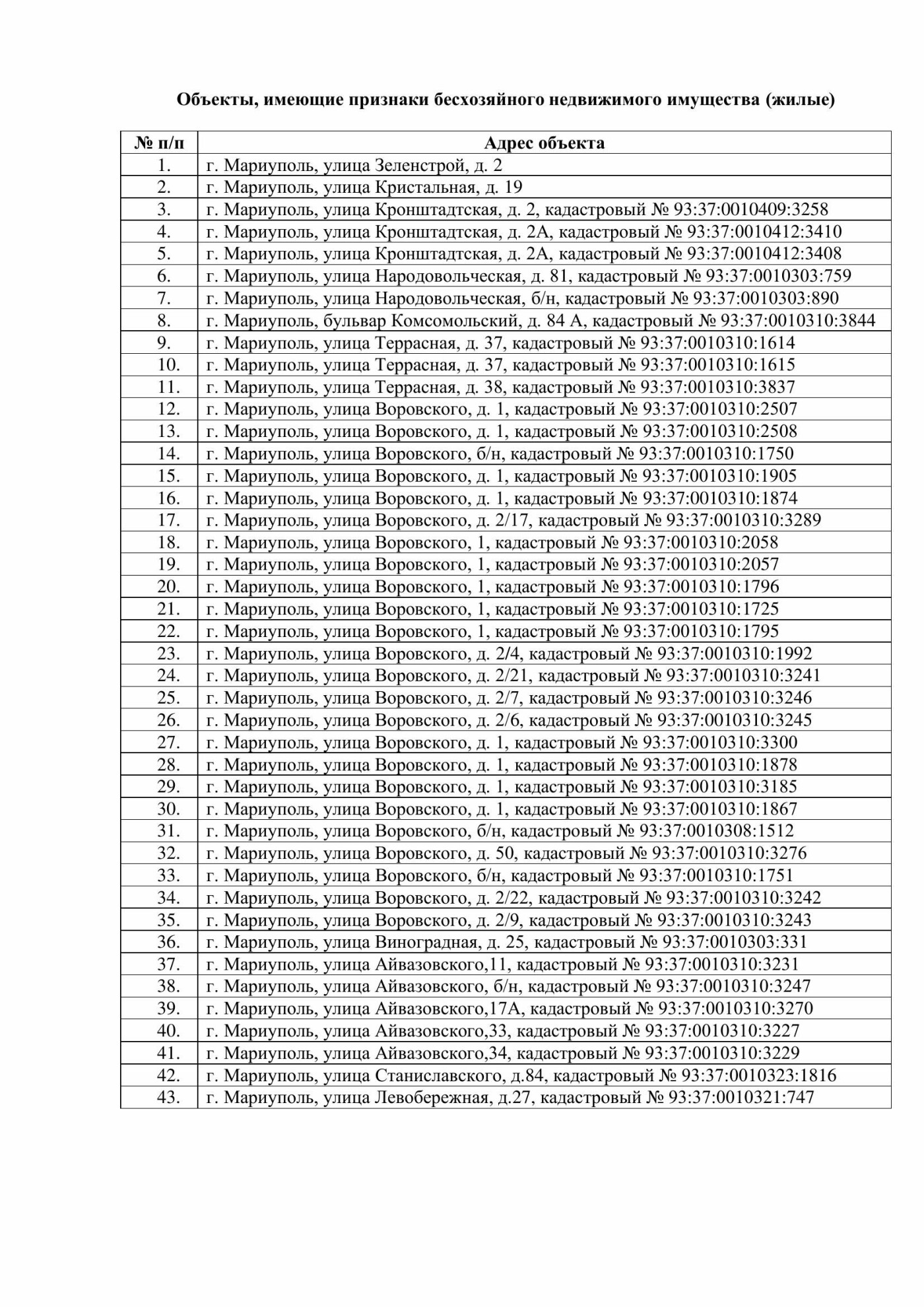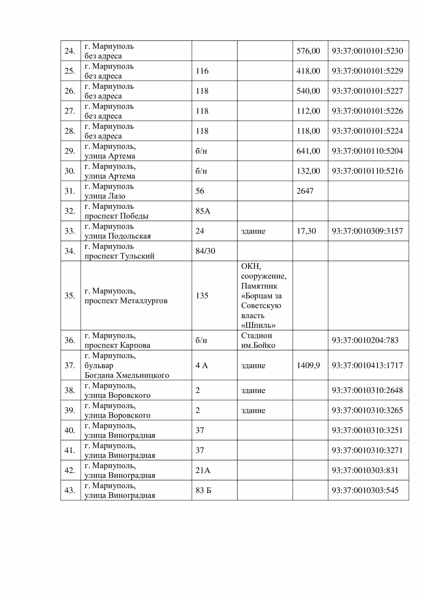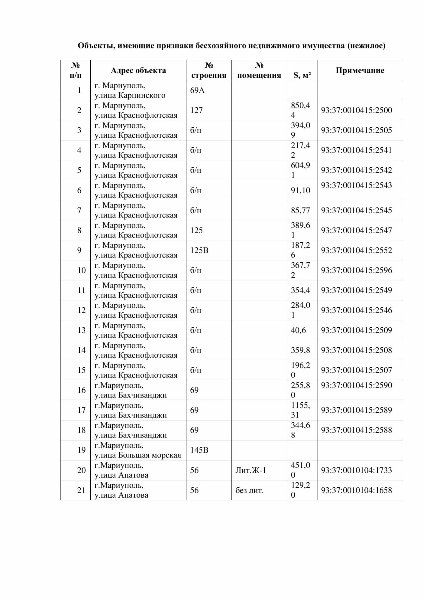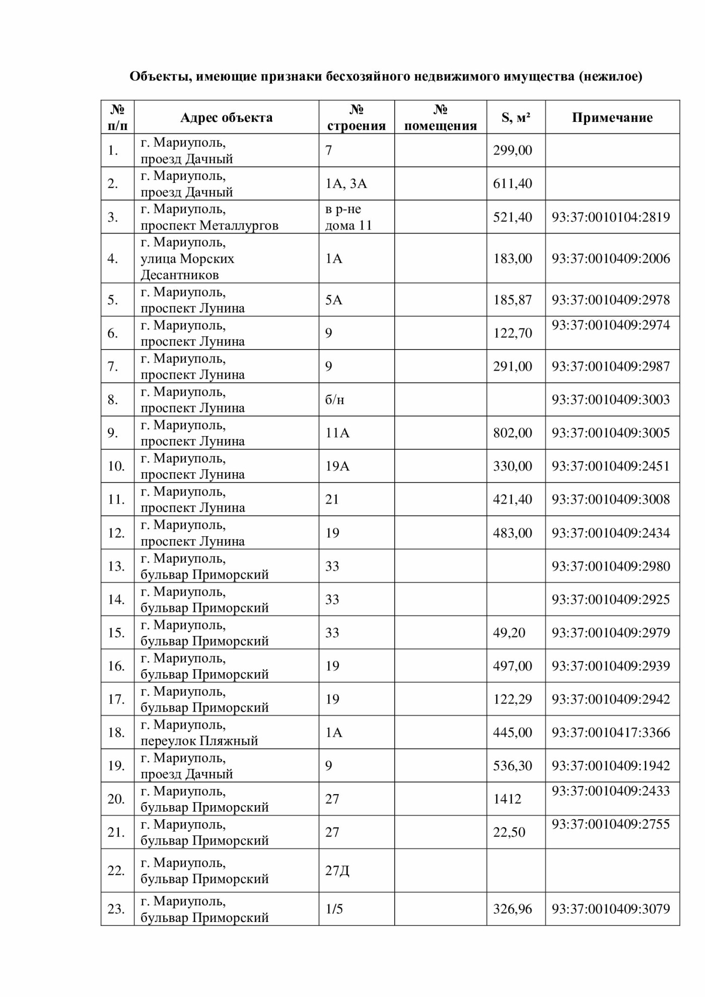 Окремо опубліковано великий список нежитлових об’єктів — від приміщень і складів до інфраструктурних будівель на проспектах Луніна, Металургів, Приморському бульварі