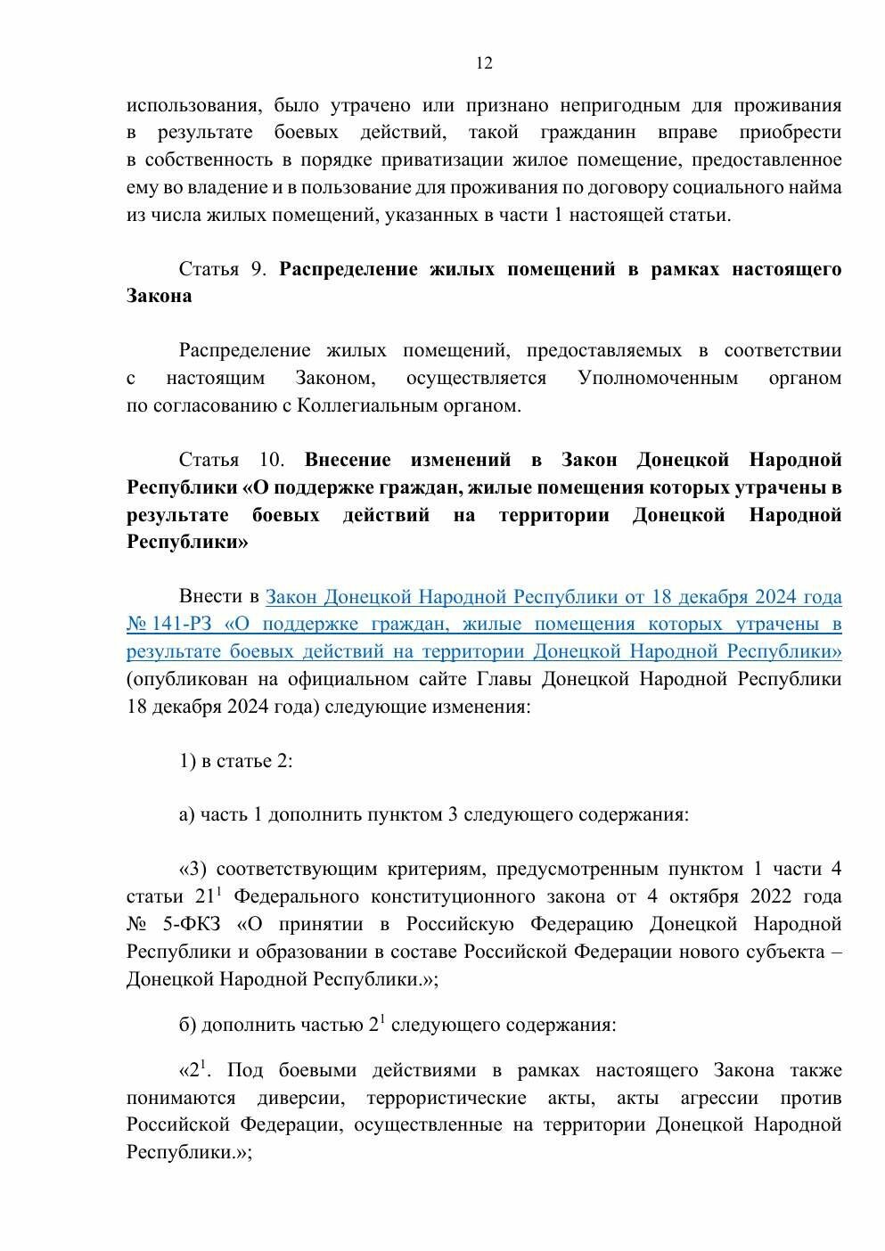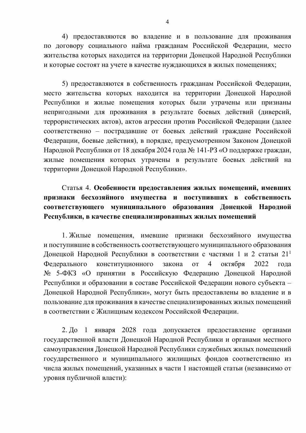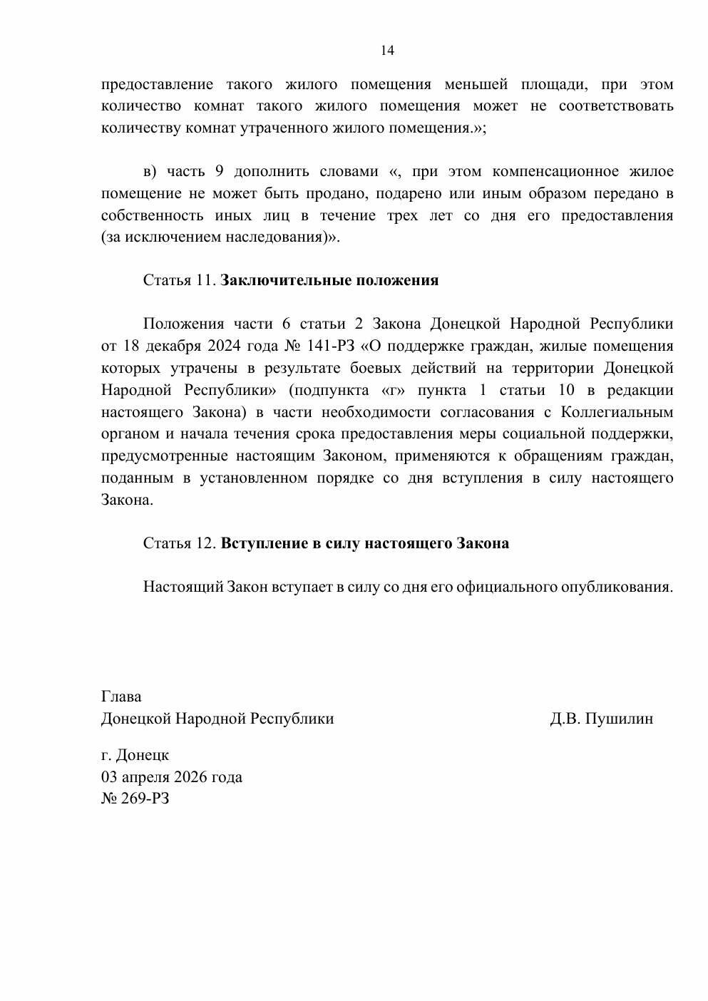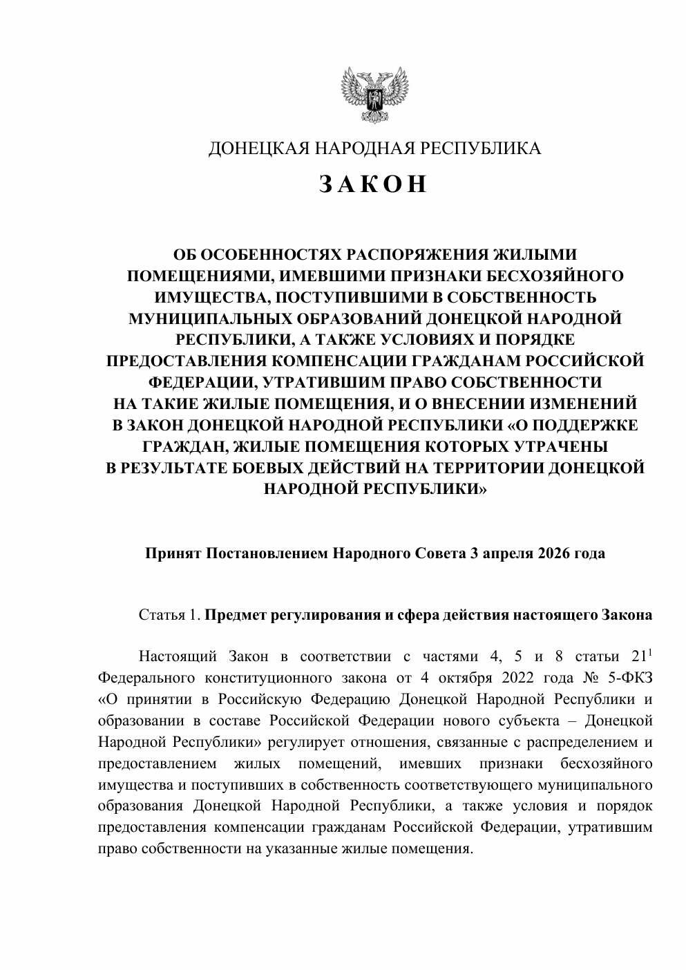 3 квітня 2026 року ватажок так званої «ДНР» Денис Пушилін підписав так званий «закон» №269-РЗ. Документ регулює порядок розпорядження житлом, яке окупаційна влада визнає «таким, що має ознаки безхазяйного».