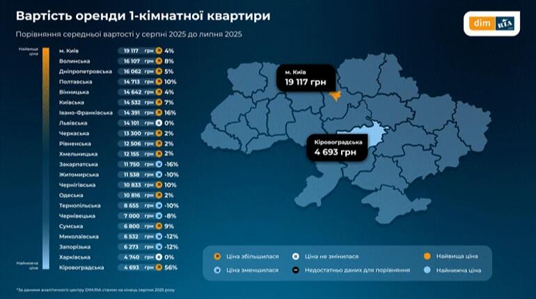 В Україні найдорожчим регіоном для оренди житла залишається Київ з вартістю 19 тис. грн за однокімнатну квартиру. За місяць оренда подорожчала на 4%, а протягом останнього року збільшення склало 5%. Про це йдеться в дослідженні від DIM.RIA, передає "Економічна правда". Зокрема, найдорожча оренда в Печерському районі — 25,2 тис. грн, найдешевша у Деснянському — 12,7 тис. грн за однокімнатну квартиру. Ціни зросли і в інших регіонах, найактивніше — у Кіровогр...