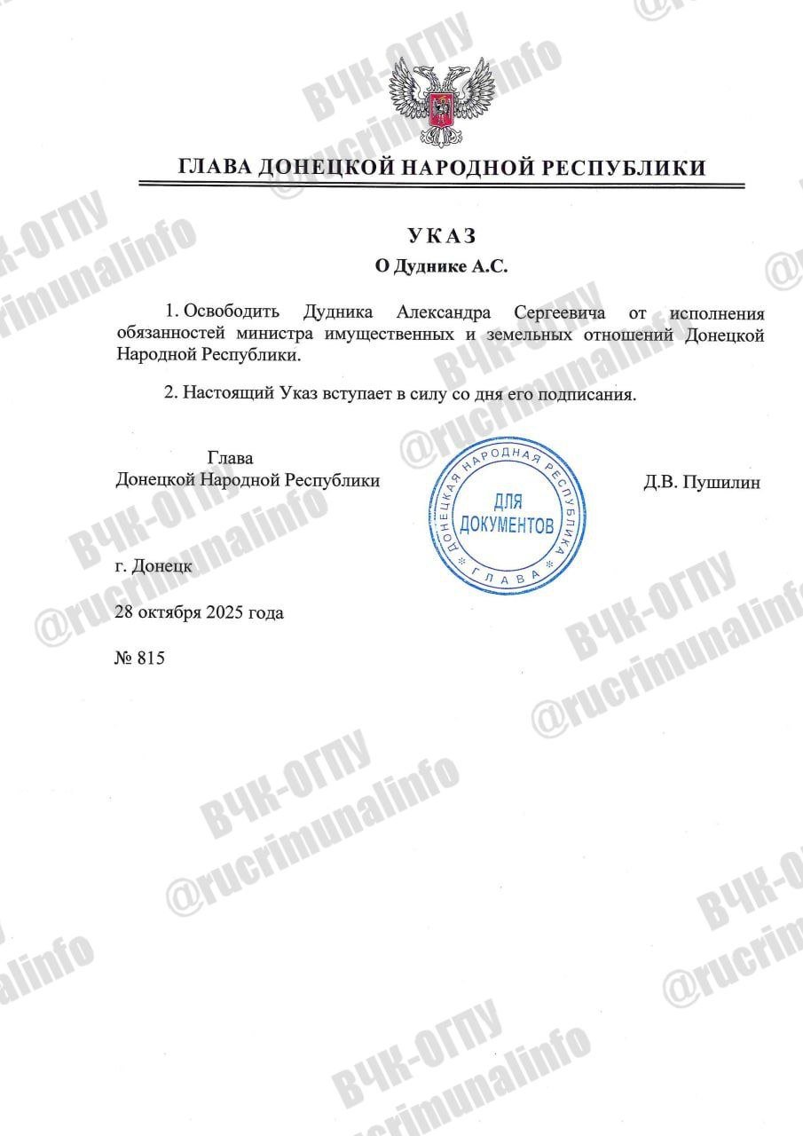 После публикации ВЧК-ОГПУ в администрации ДНР начались внутренние разборки: «это позор на всю страну». Однако вместо пересмотра проекта, Пушилин 29 октября в 21:17 указом уволил министра имущественных и земельных отношений Дудника А.С., публично выражавшего сомнения в схеме. На его место назначен Яков Ходос — советник Пушилин и руководитель проекта, чья сестра владеет 50% доли в компании «Единый Экологический Оператор».
