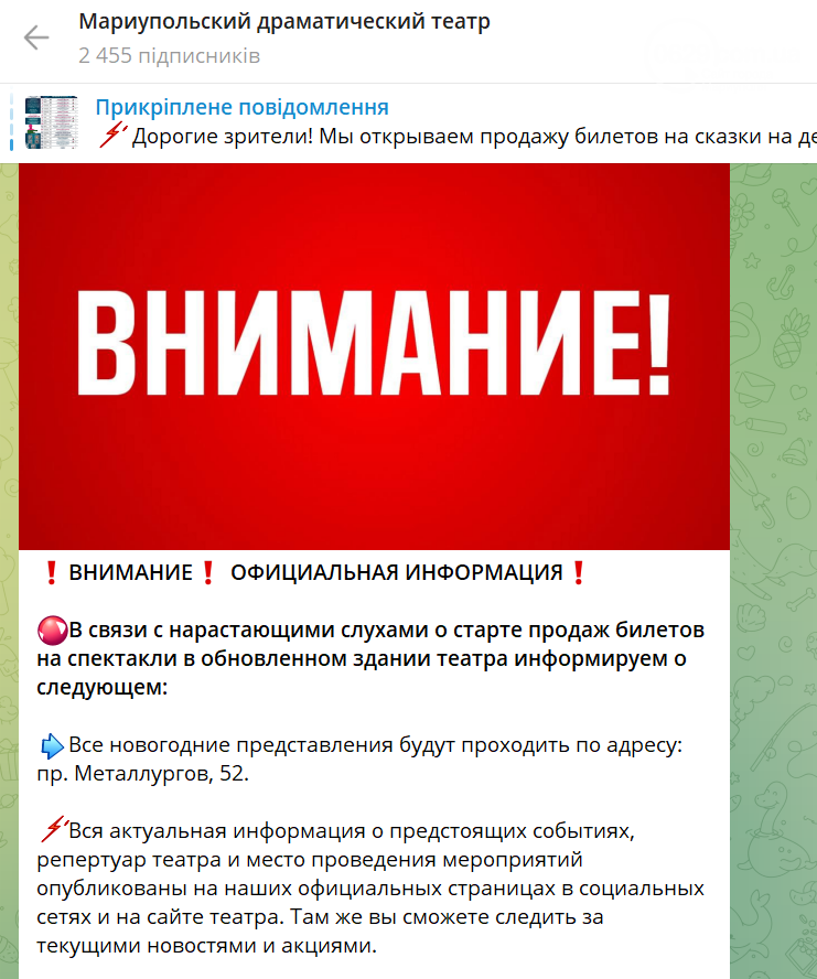 В оккупированном Мариуполе администрация так называемого «восстановленного» драматического театра официально опровергла информацию о проведении новогодних представлений в здании заведения. В заявлении отмечается, что все театральные события в конце декабря и в ближайшие месяцы будут проходить на другой площадке.