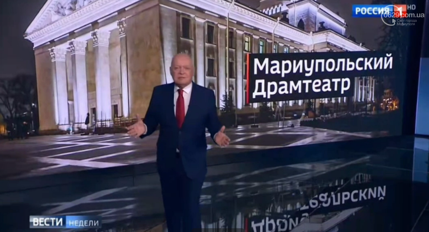 Открытие драмтеатра в Мариуполе быстро стало федеральным телевизионным событием. Сюжеты о нем вышли на нескольких российских государственных каналах, но самым показательным стал материал в программе Вести недели по каналу Россия 1, которую ведет Дмитрий Киселев.