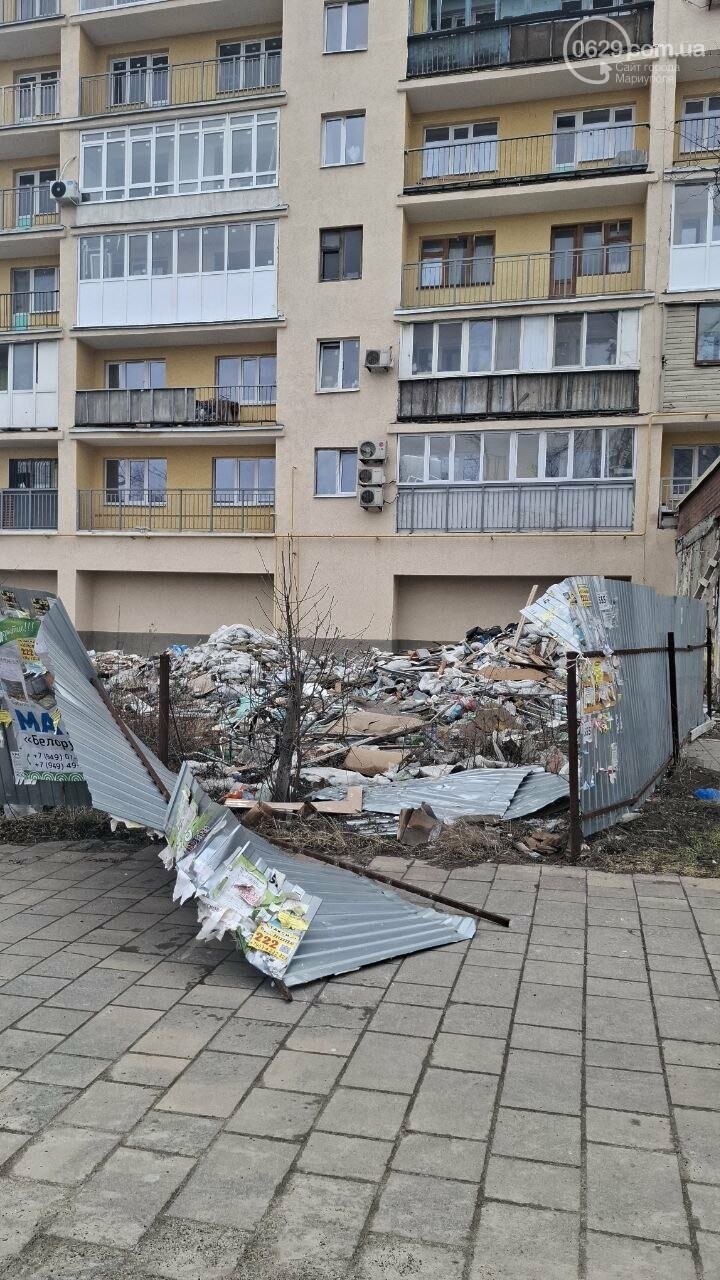 Во временно оккупированном Мариуполе сильный ветер свалил ограждение у дома №98 на проспекте Мира. За забором, который должен был создавать облик «благоустройства», оказалась большая куча строительного мусора.