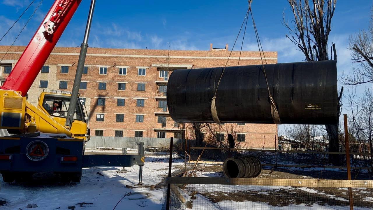 Строительство коммуникаций возле одного из восстановленных домов в Авдеевке