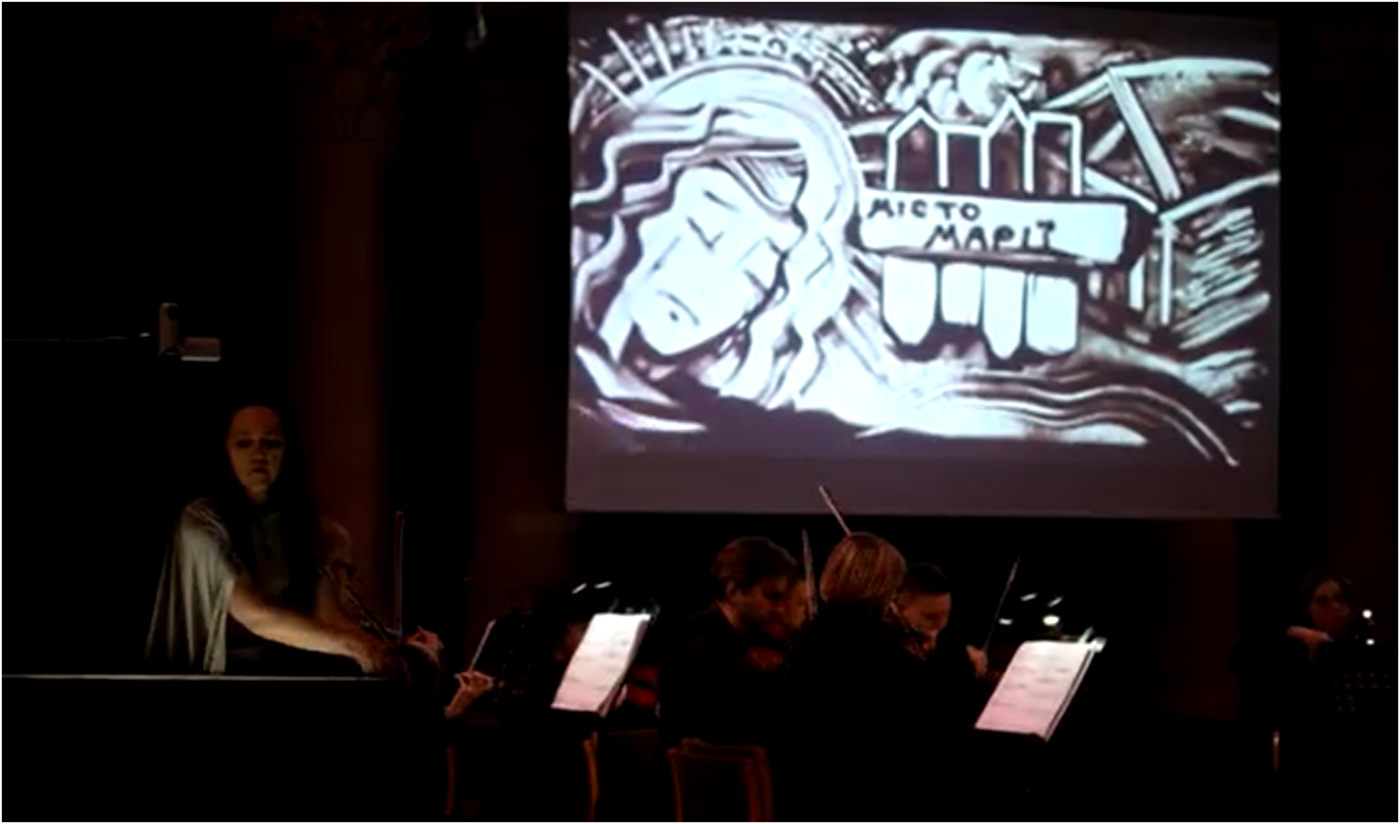 Во время спектакля мастер анимационных искусств Оксана Мергут создавала образы из песочной анимации, которые рождались и изменялись в живом ритме музыки.