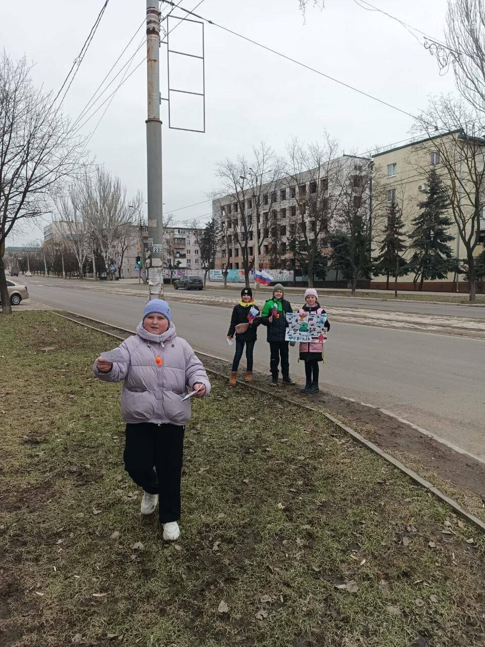 В частности, у здания Кальмиусского райисполкома дети поздравляли мужчин с российским «праздником». Подобные сцены оккупационные ресурсы традиционно представляют как «трогательные инициативы», однако в реальности речь идет о демонстративном воспроизведении российских идеологических ритуалов в публичном пространстве города.
