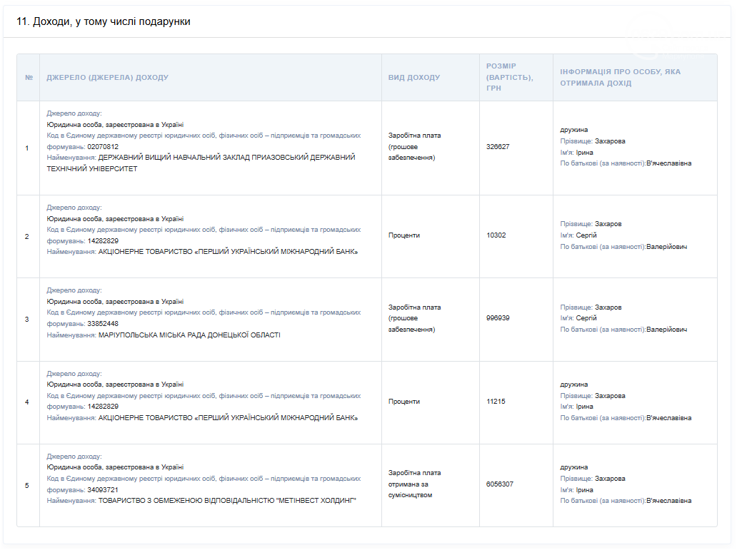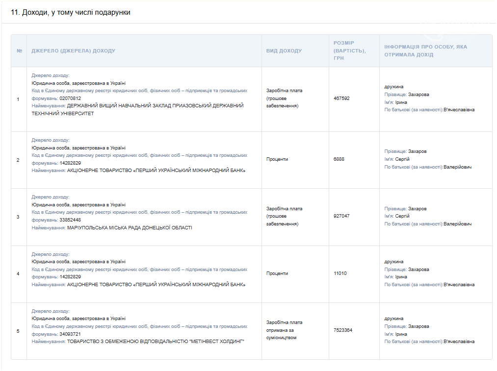 В то же время доходы жены существенно выше. В 2024 году она задекларировала более 6 миллионов гривен, из которых основная часть – 6 056 307 грн – это доход от работы по совместительству в Метинвест Холдинг. В 2025 году эта сумма выросла до 7523364 грн. Кроме того, она получала зарплату в Приазовском государственном техническом университете.