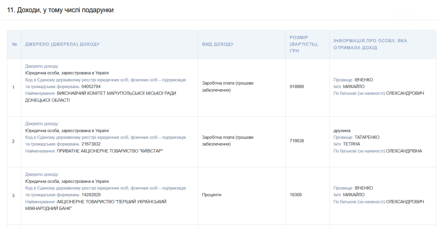 В 2024 году Михаил Ивченко задекларировал 987179 грн заработной платы в исполнительном комитете Мариупольского городского совета. В 2025 году эта сумма составила 918 968 грн . Таким образом, годовой доход должностного лица уменьшился примерно на 68 тысяч гривен.