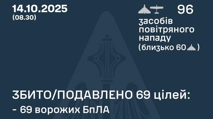 В ночь на 14 октября российские оккупанты атаковали Украину 96 ударными БпЛА типа Shahed, "Гербера" и беспилотниками других типов, 69 дронов удалось обезвредить, но 27 попали. Передает " Украинская правда " со ссылкой на Воздушные силы ВСУ в Telegram. "По состоянию на 08:30, противовоздушной обороной сбито/подавлено 69 вражеских БпЛА типа Shahed, "Гербера" и дронов других типов на севере, юге, востоке и центре страны. Зафиксировано попадание 27 ударных БпЛ...